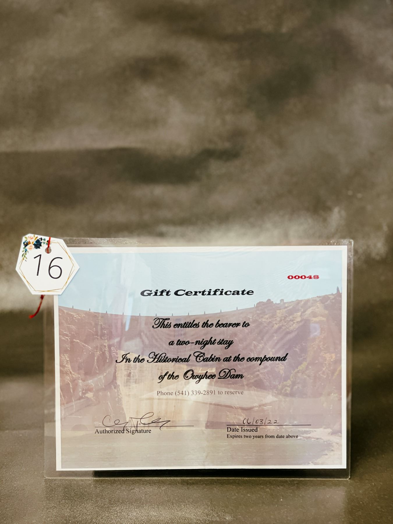 2 night stay Cabin Rental at the Owyhee Dam - choice between a family cabin and a cabin that sleeps 2-4 people. Expires June 2024.