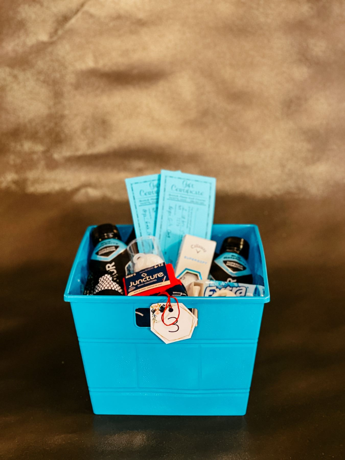 2 18 Hole + 1 cart gift certificates to Scotch Pines Golf Course in Payette, ID, 2 blue raspberry body armors, gum, 4 golf tees, 6 golf balls, socks.