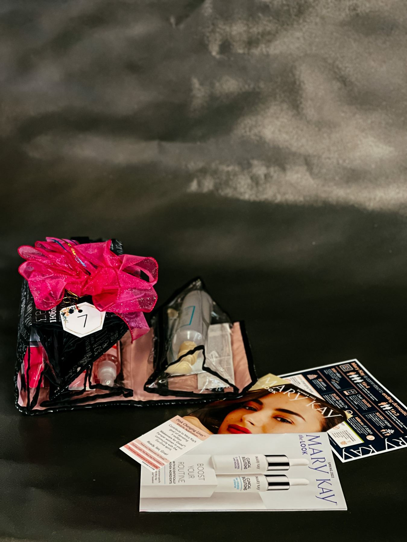Mary Kay Travel Roll-Up Bag, Pocket 1: $25 gift certificate & catalog, Pocket 2: Beard Oil (for him) & Lip Kit (for her), Pocket 3: Sparkling Cherry Lotion & Mist (for her), Pocket 4: Hand Soap and Hand Cream (for everyone).
