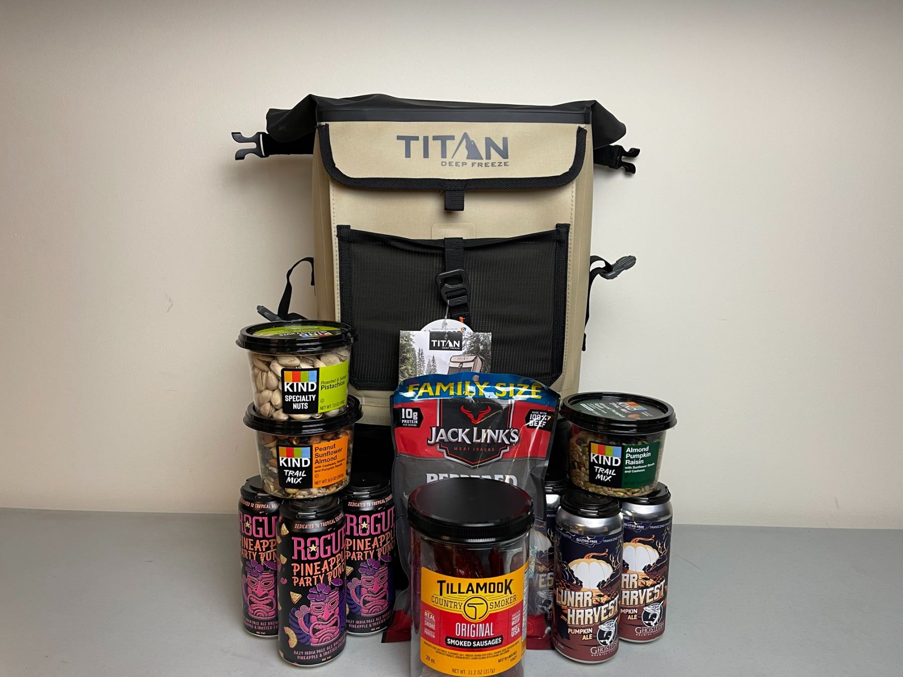 Titan Deep Freeze Waterproof Leakproof Backpack Cooler (holds 24 cans), 4 Rogue Pinapple Party Punch, 4 Ghostfish Lunar Harvest Pumpkin Ale, Tillamook Smoked Sausage, Peppered Beef Jerkey, KIND Pistachios, KIND Almond Pumpkin Raisin Mix, KIND Peanut Sunflower Almond Mix