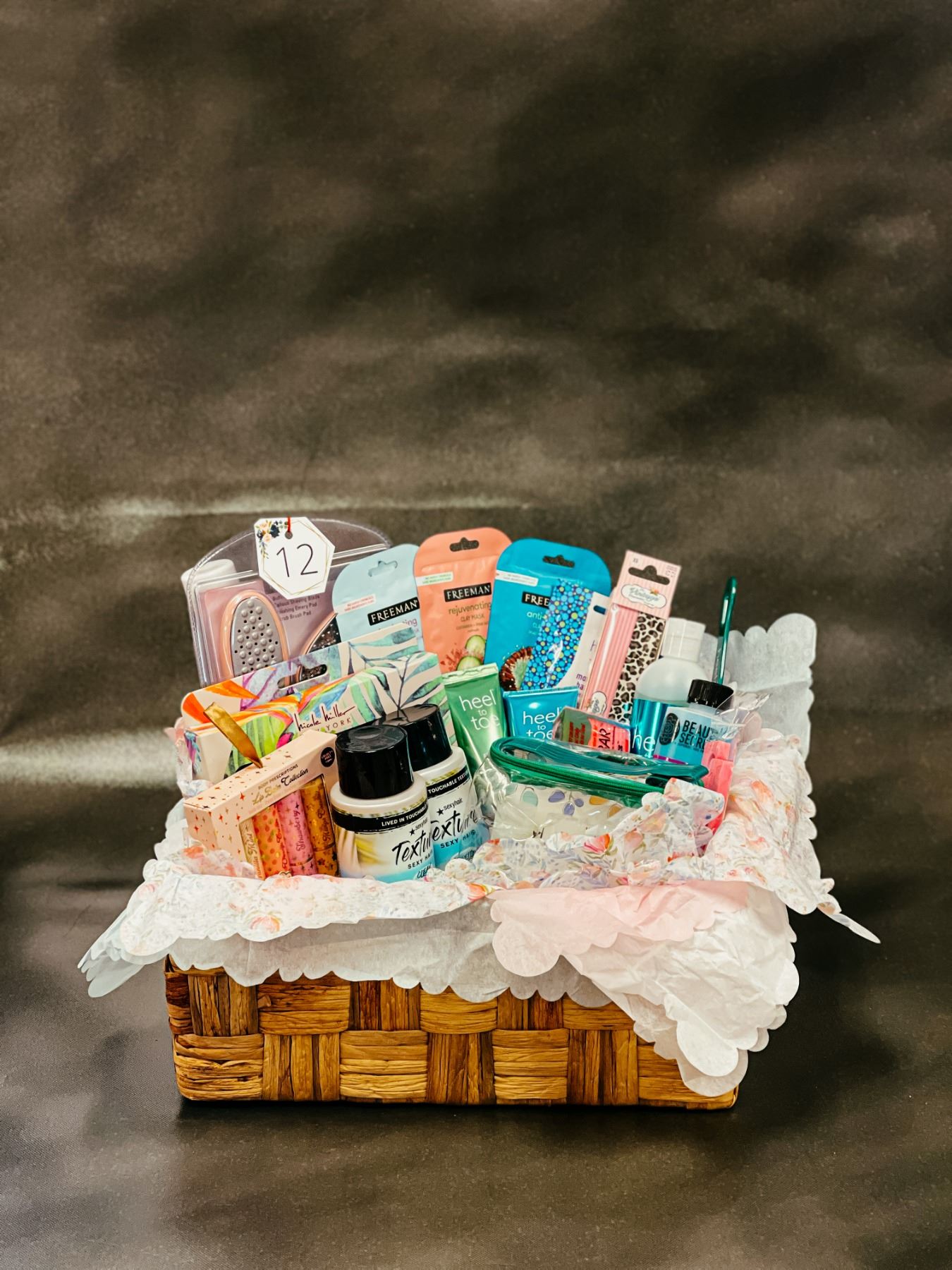 "Gena" Pedicure Kit, "Sexy Hair" Texturizing Conditioner x2, Set of 4 Lip balm, signature spa room fragrance, "Nichole Miller - New York" nail polish set, Pumi Bar, Nail Polish Remover, Heel to Toe pedicure supplies, buffing pumice pad, callous shaving, polishing emery pad, and scrub brush pad.